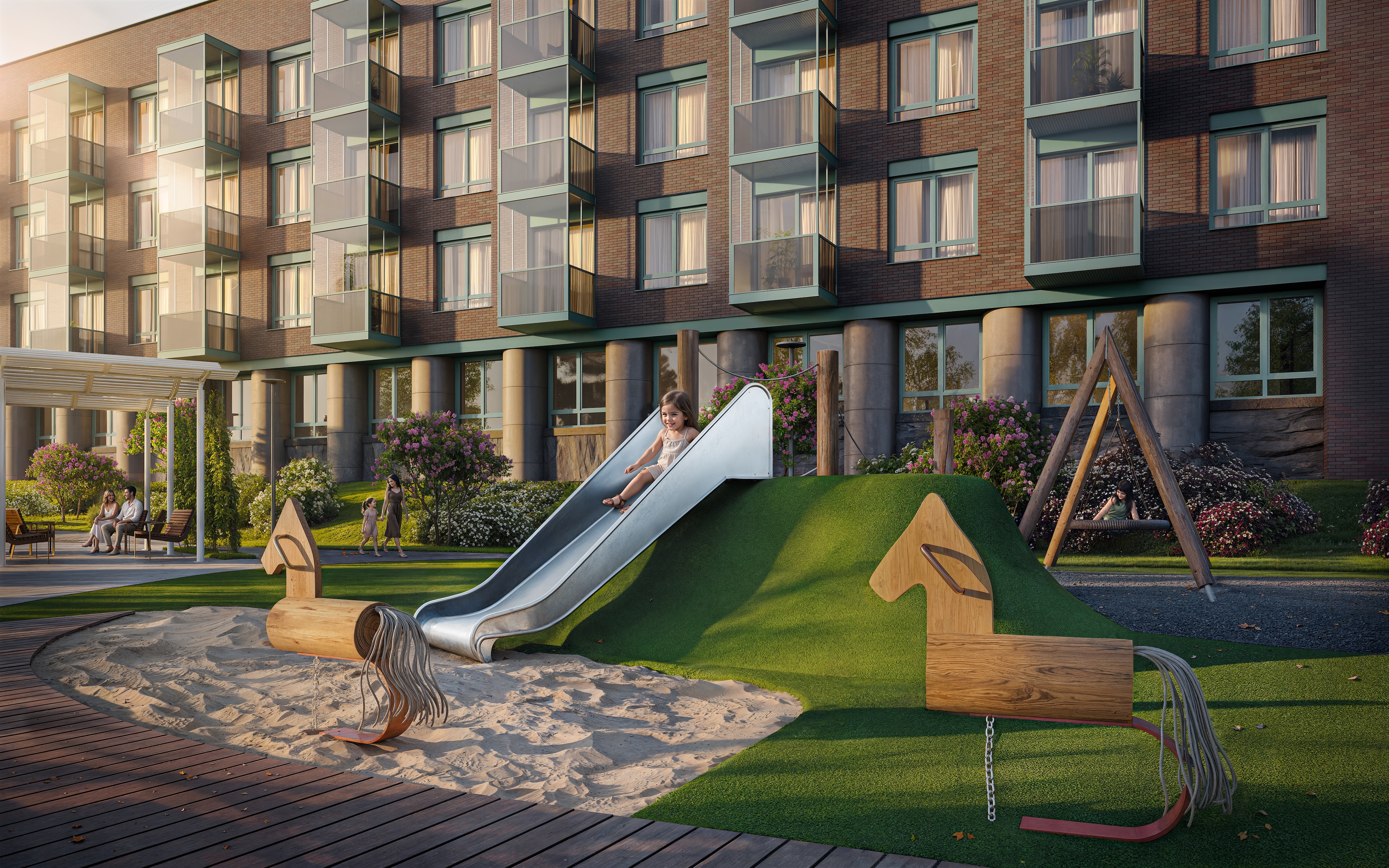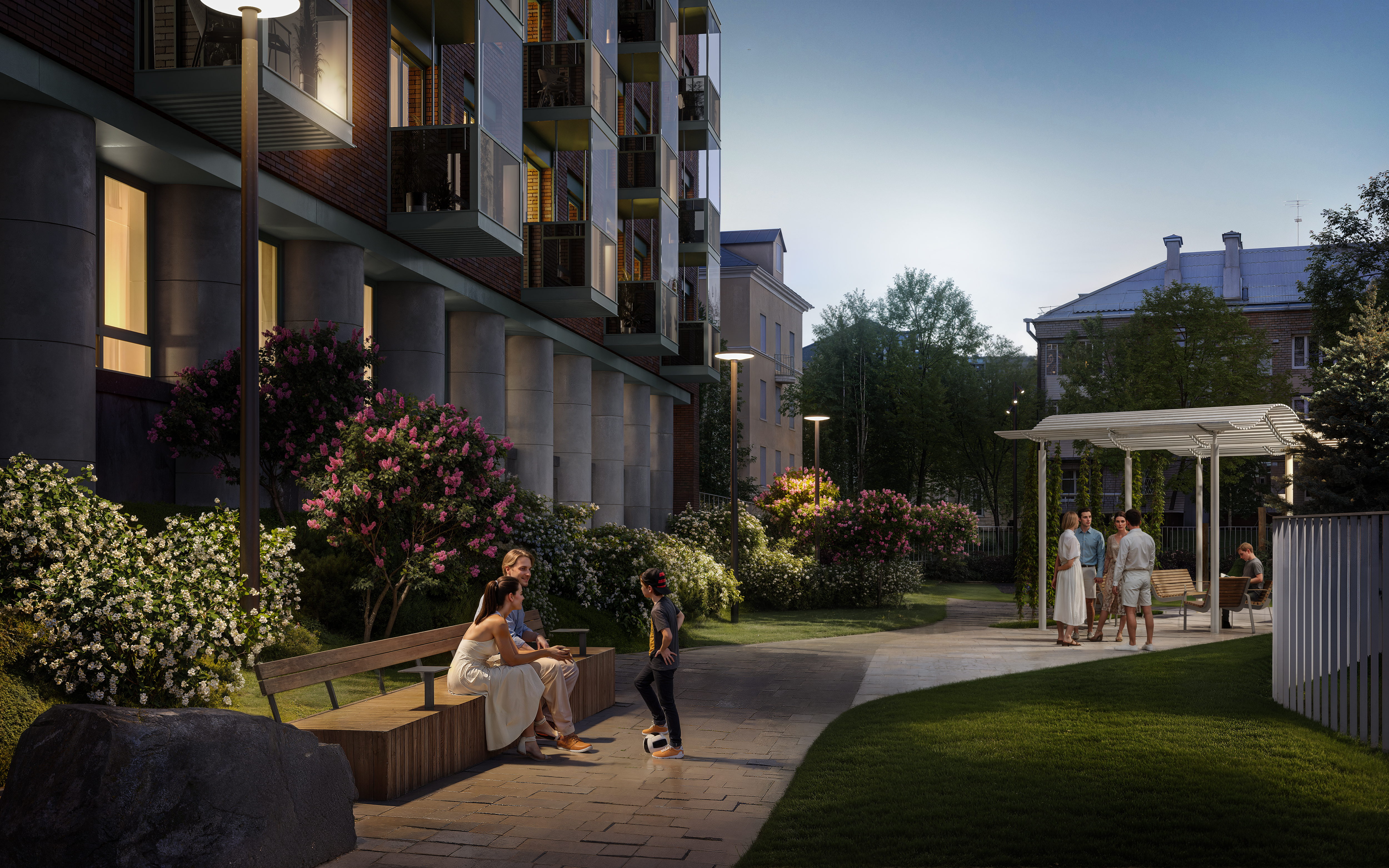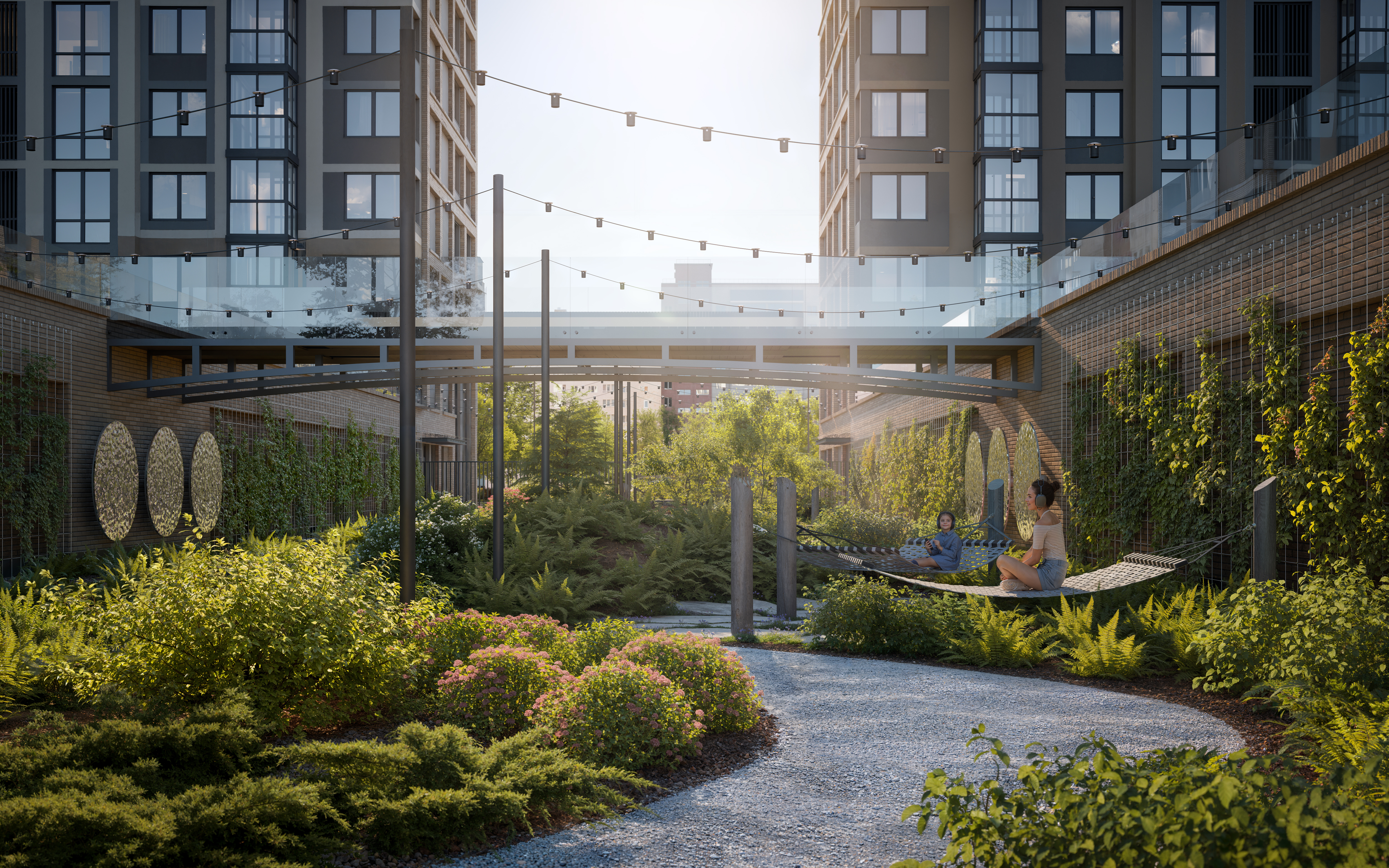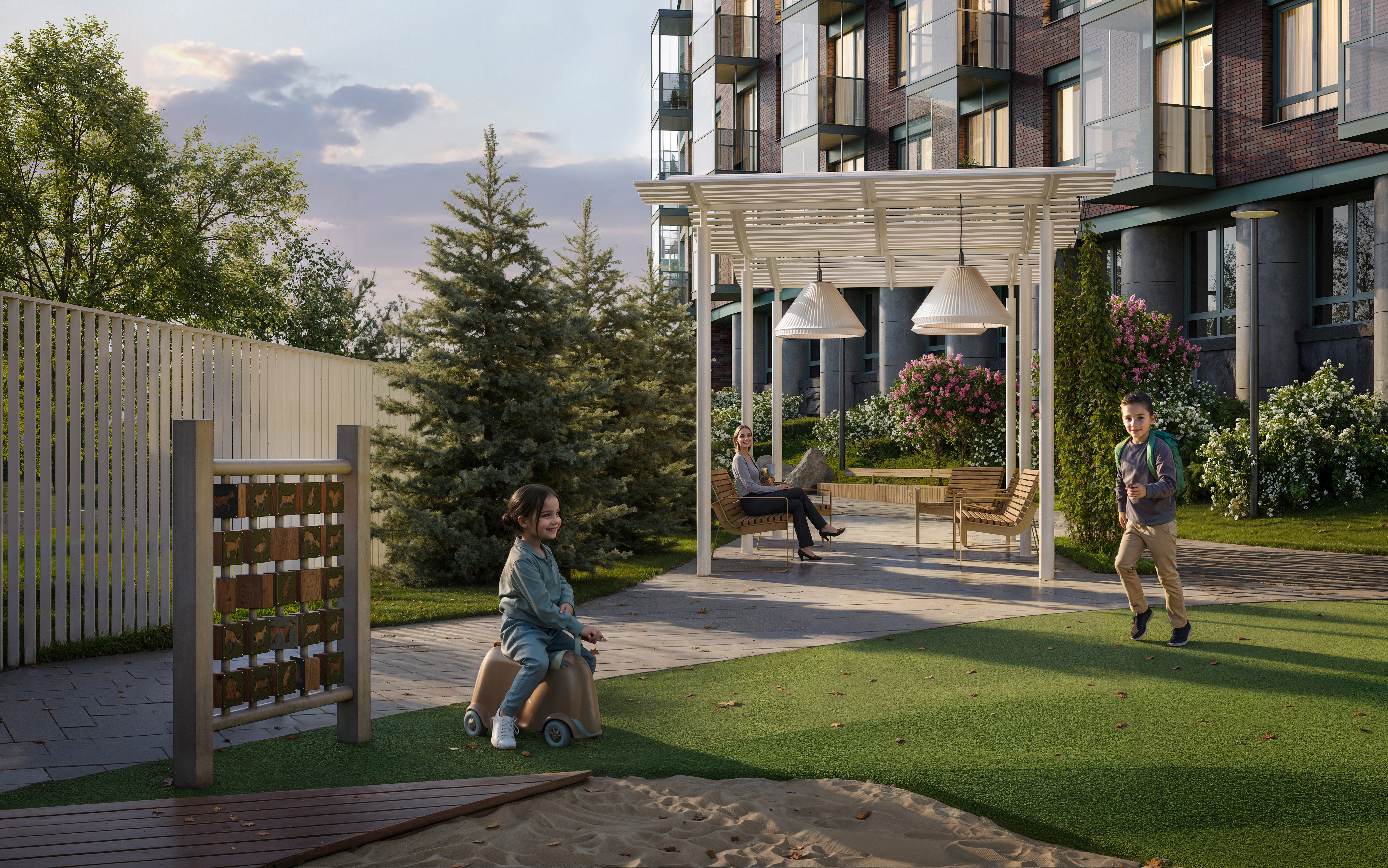 Вся территория дома утопает в зелени. Это пространство без машин, только для отдыха. Здесь появится миниатюрный амфитеатр, уютная беседка-пергола, детская площадка.
