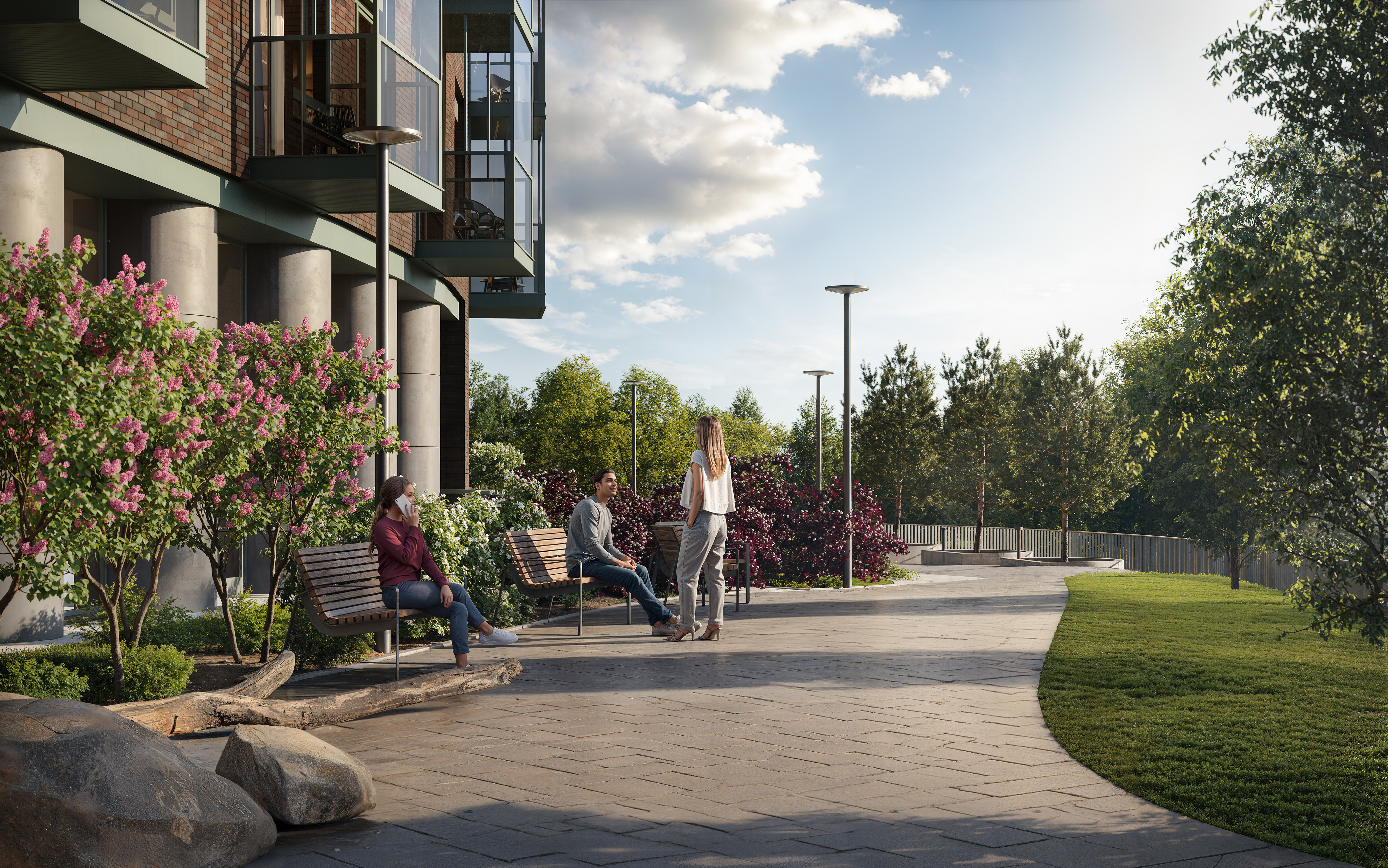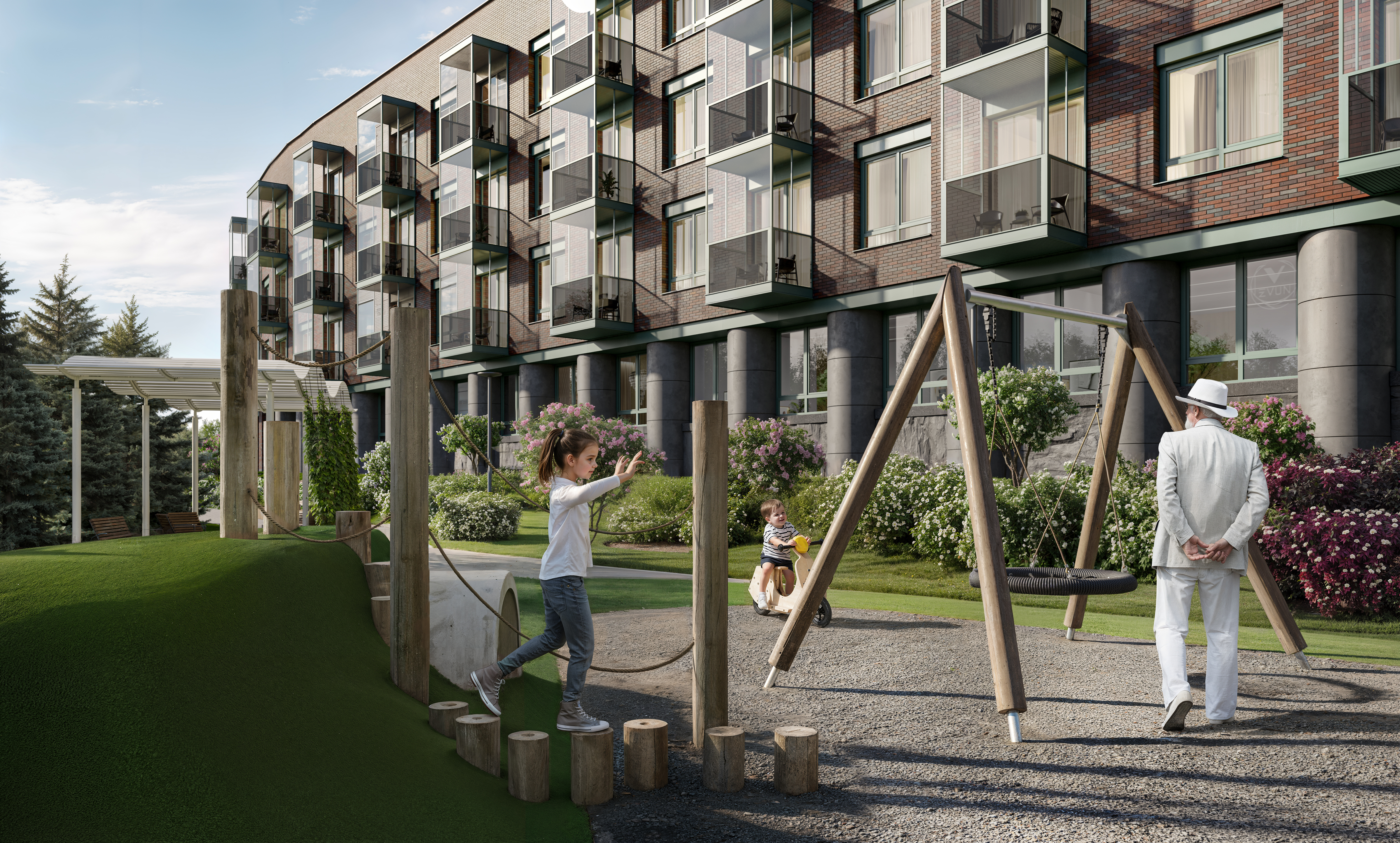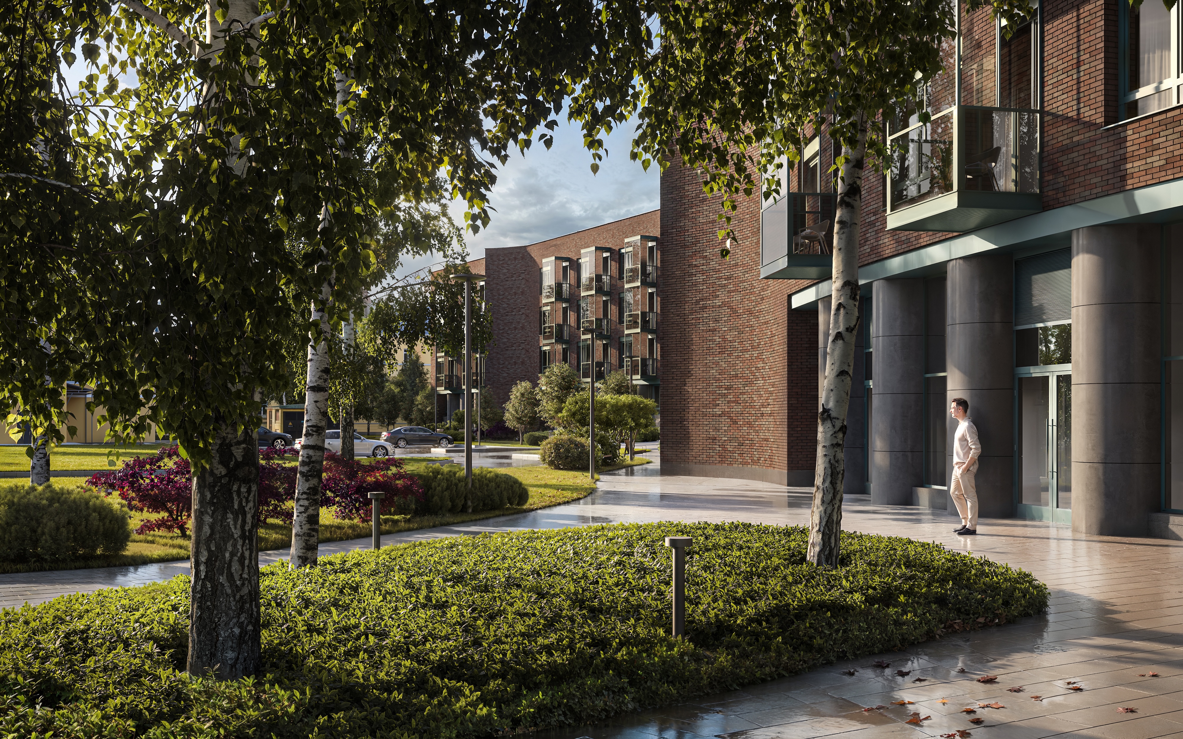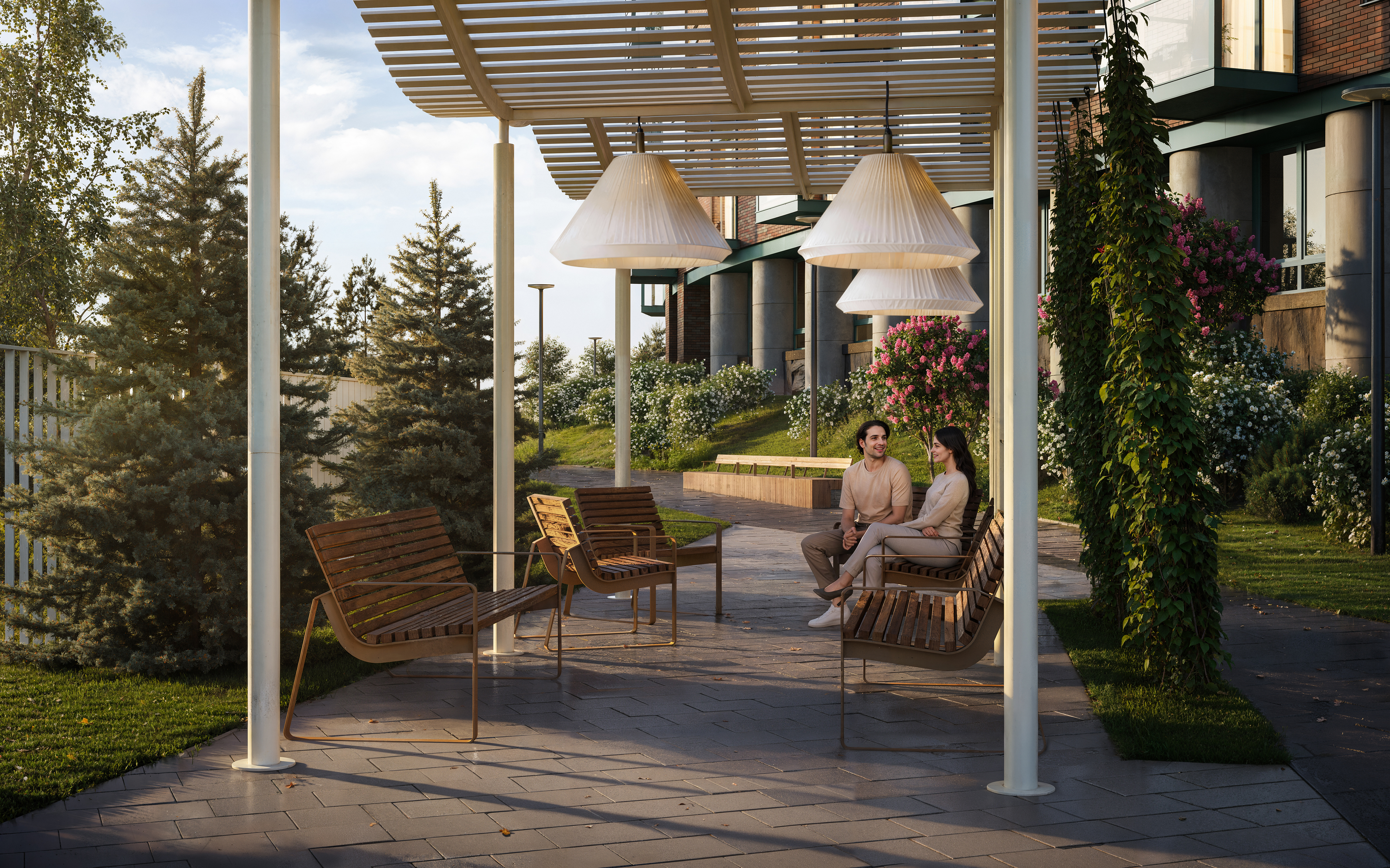 Вся территория дома утопает в зелени. Это пространство без машин, только для отдыха. Здесь появится миниатюрный амфитеатр, уютная беседка-пергола, детская площадка.