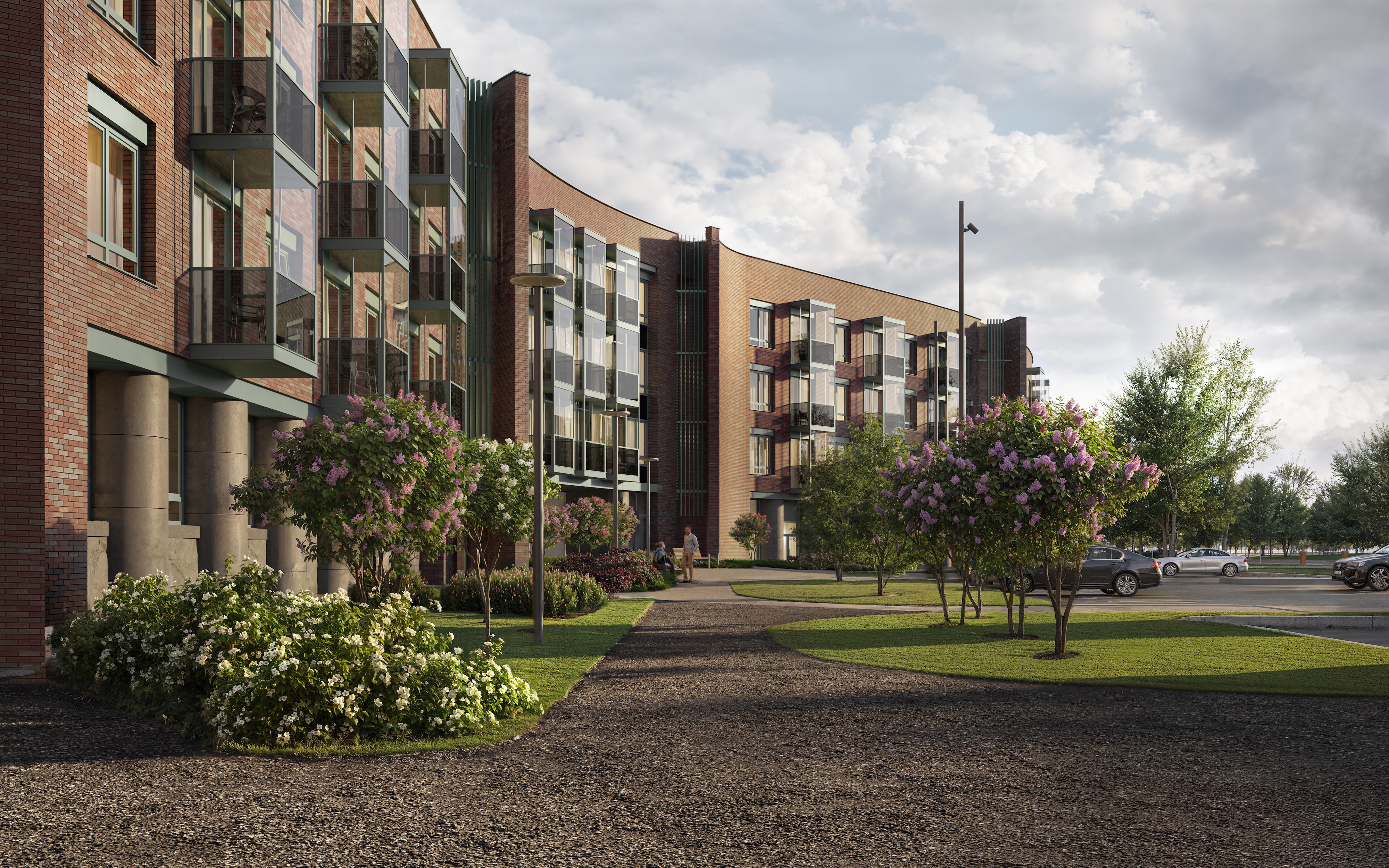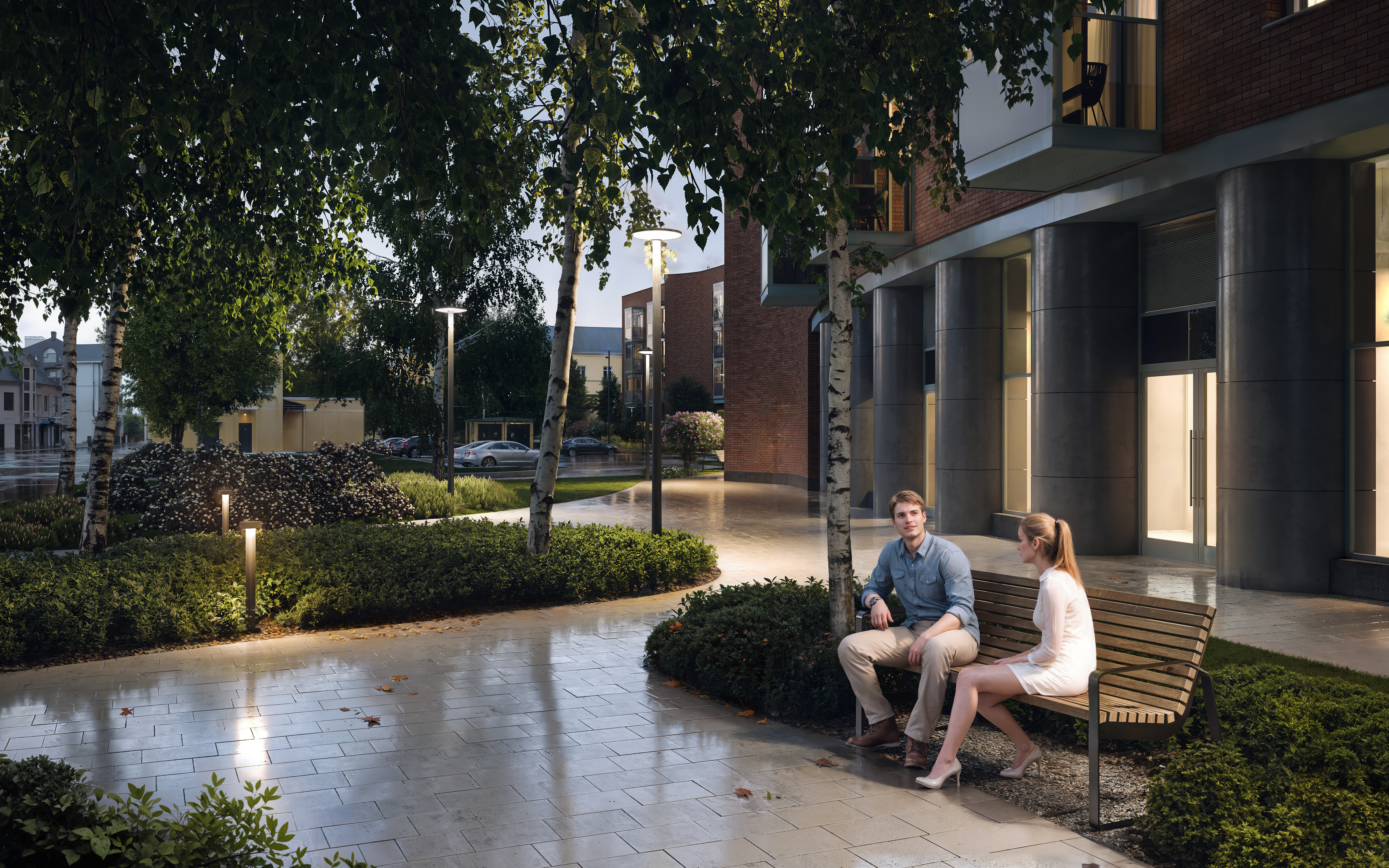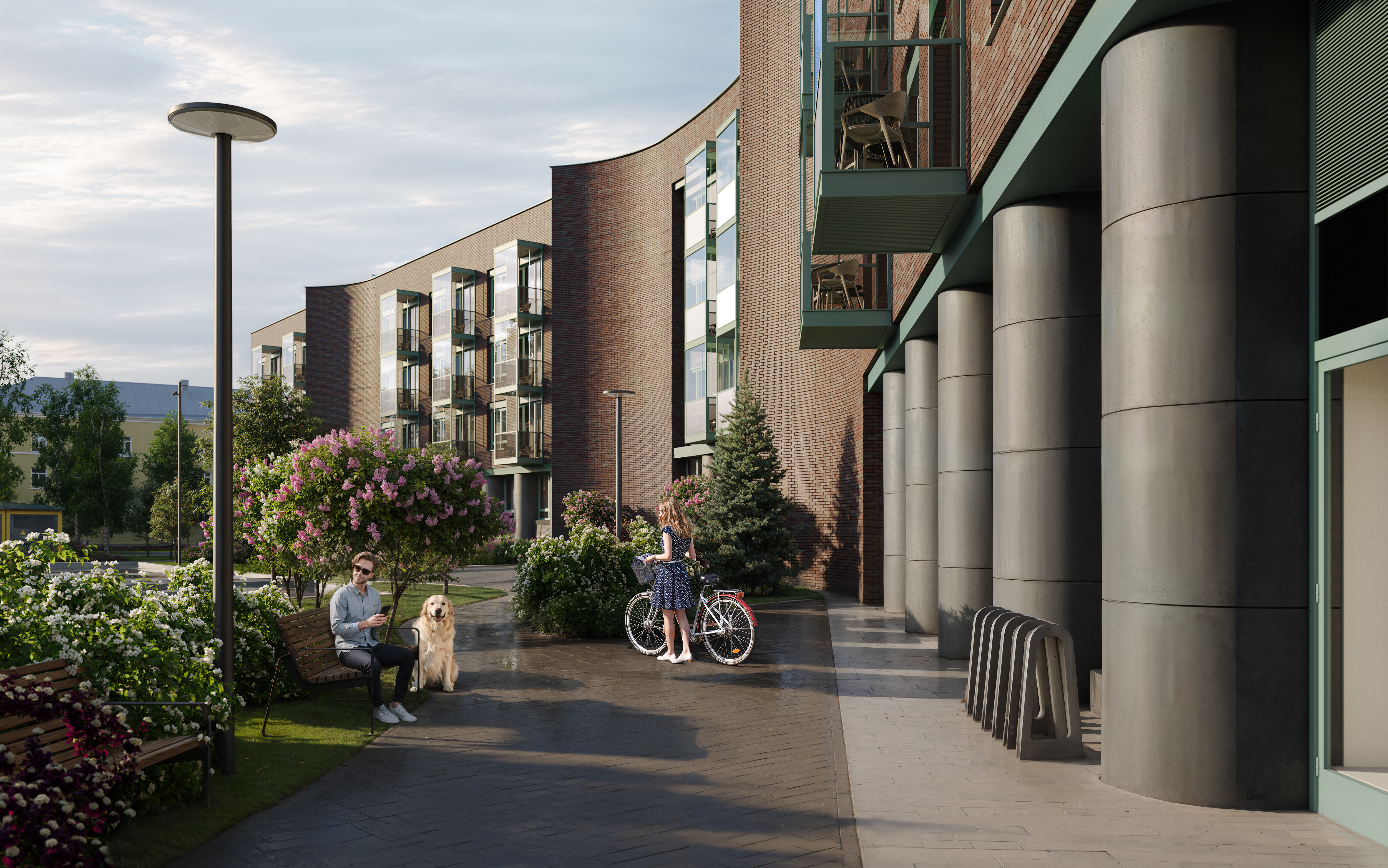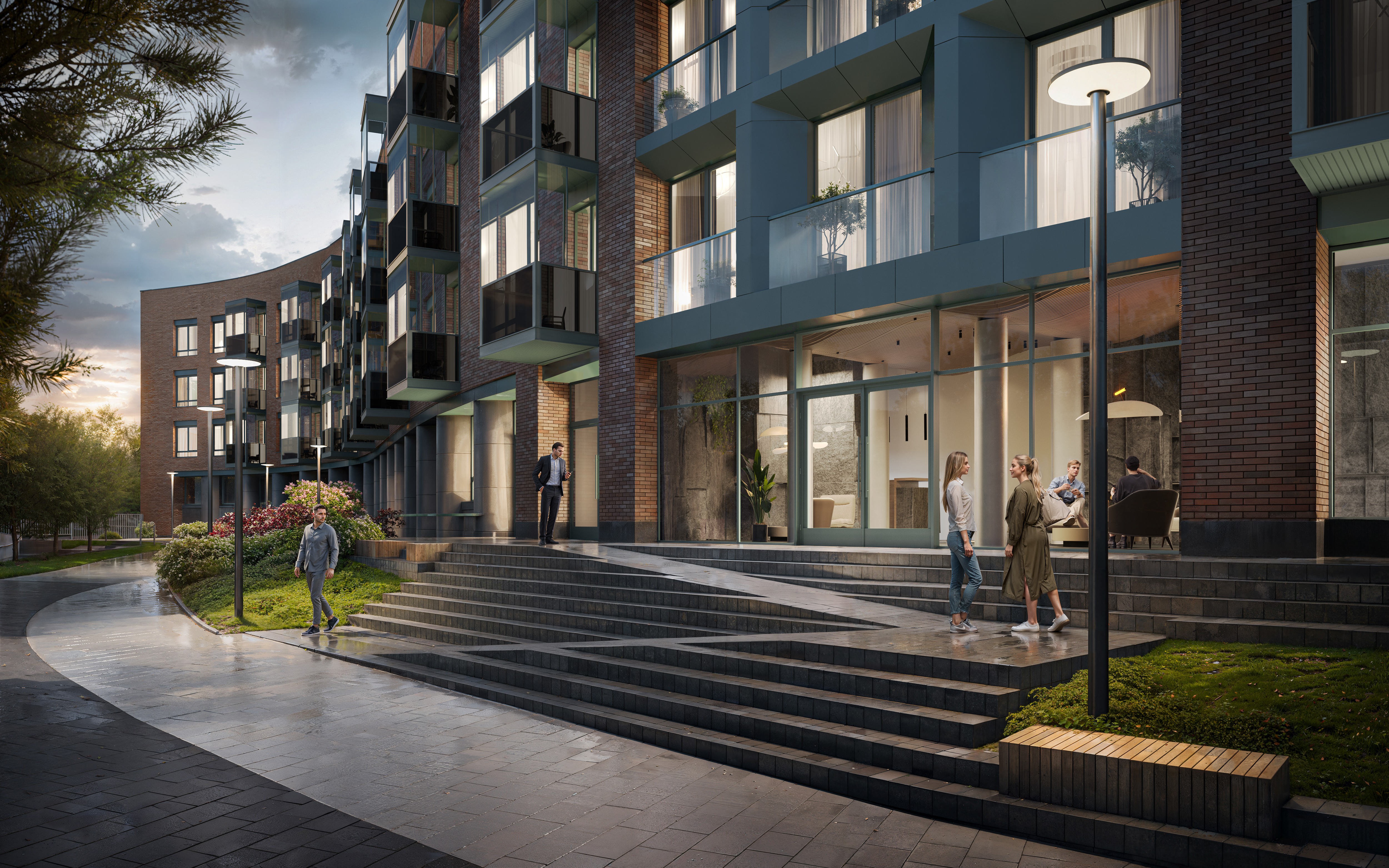 Вся территория дома утопает в зелени. Это пространство без машин, только для отдыха. Здесь появится миниатюрный амфитеатр, уютная беседка-пергола, детская площадка.
