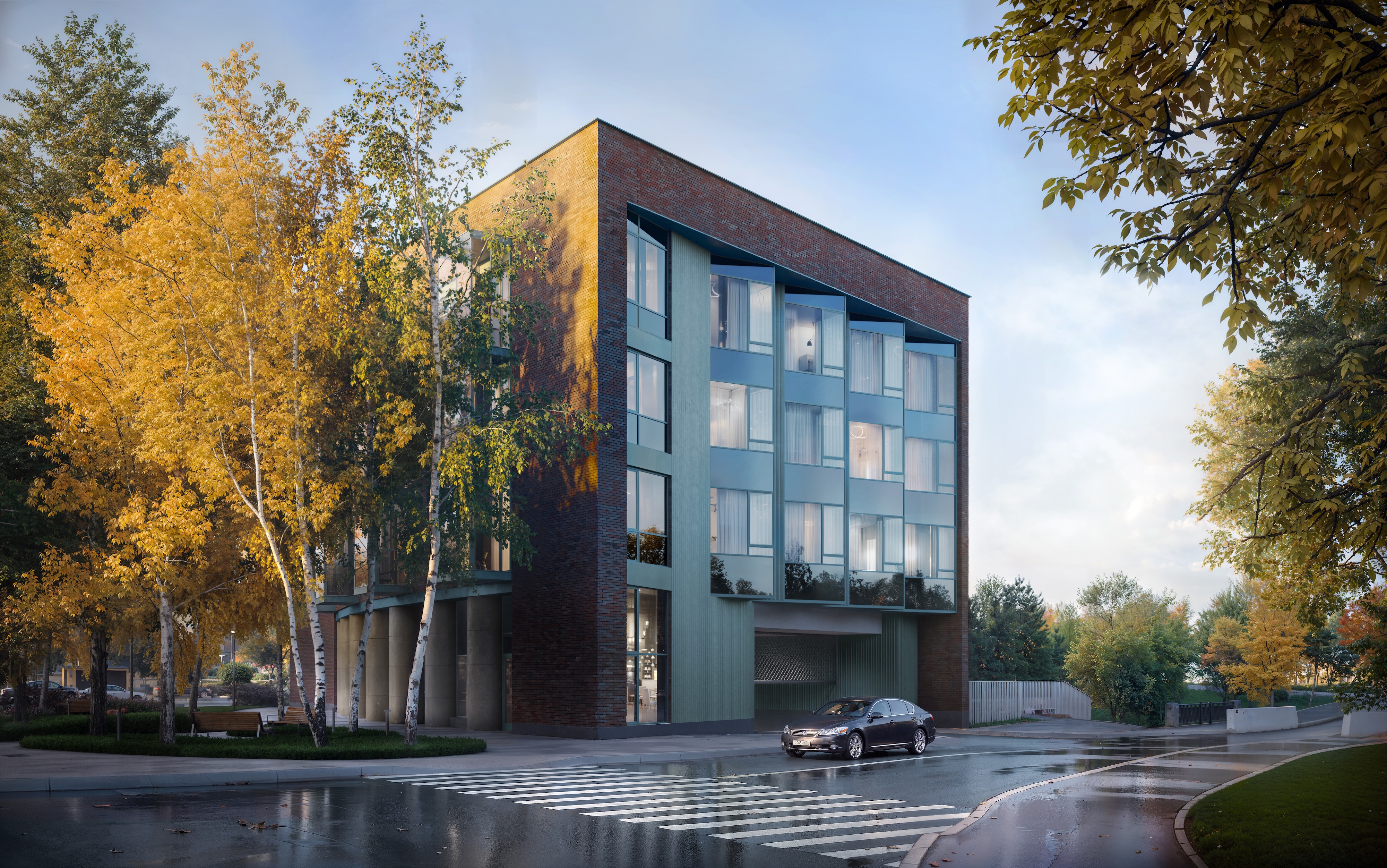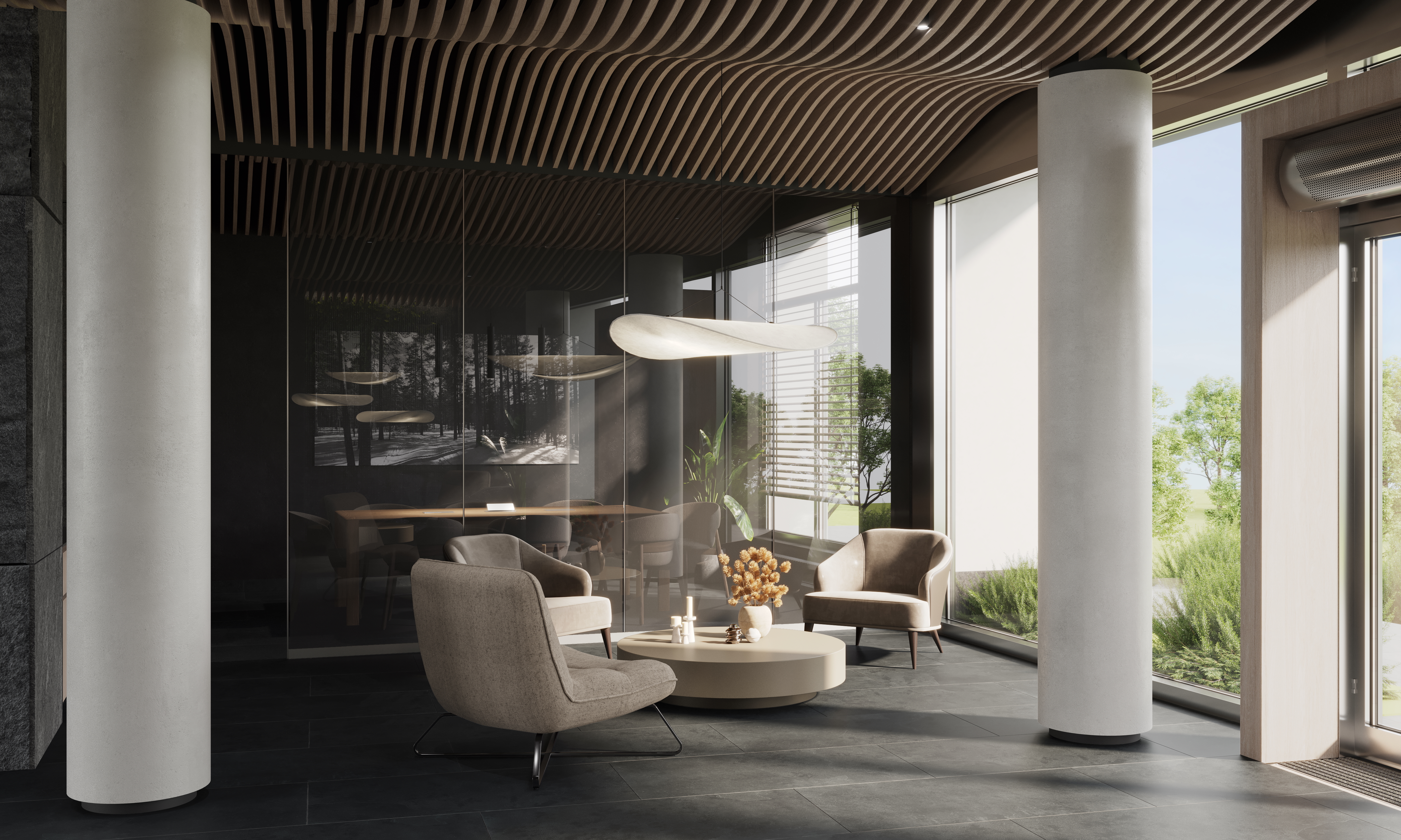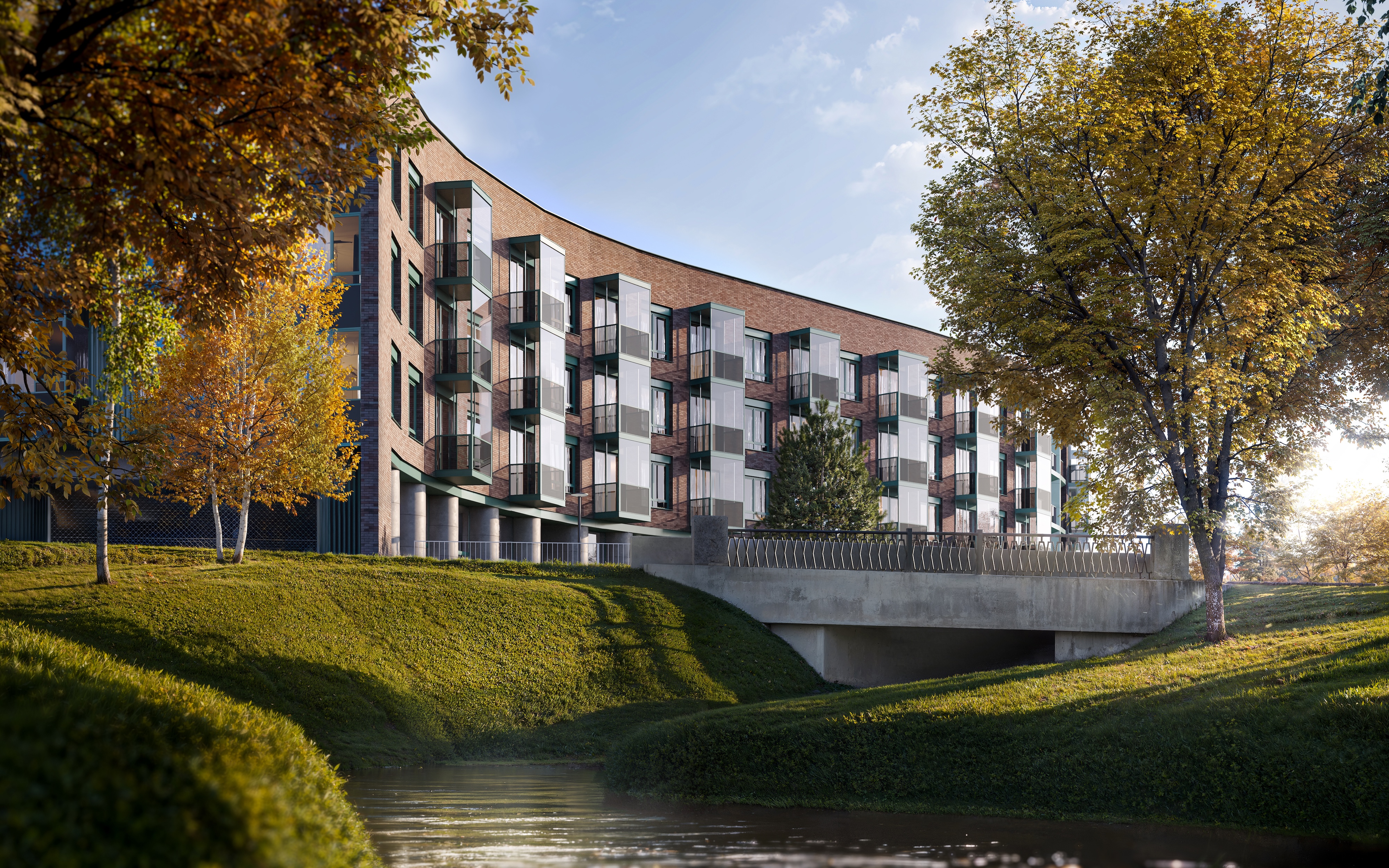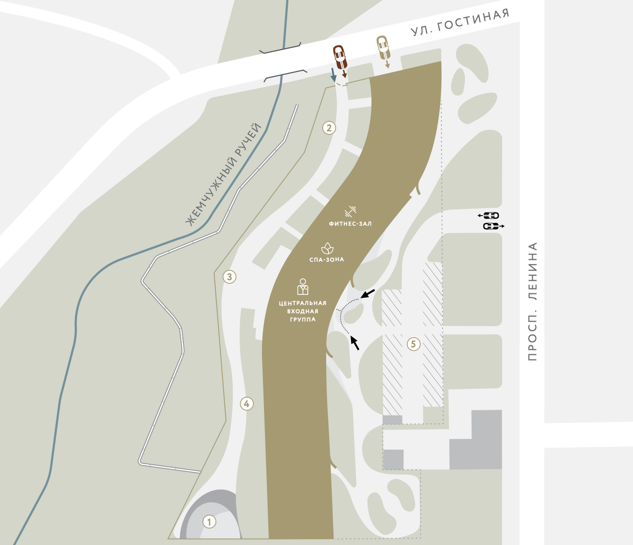Изящный фасад комплекса визуально созвучен изгибу Жемчужного ручья — течение водоёма у дома продолжается в плавных линиях архитектуры.