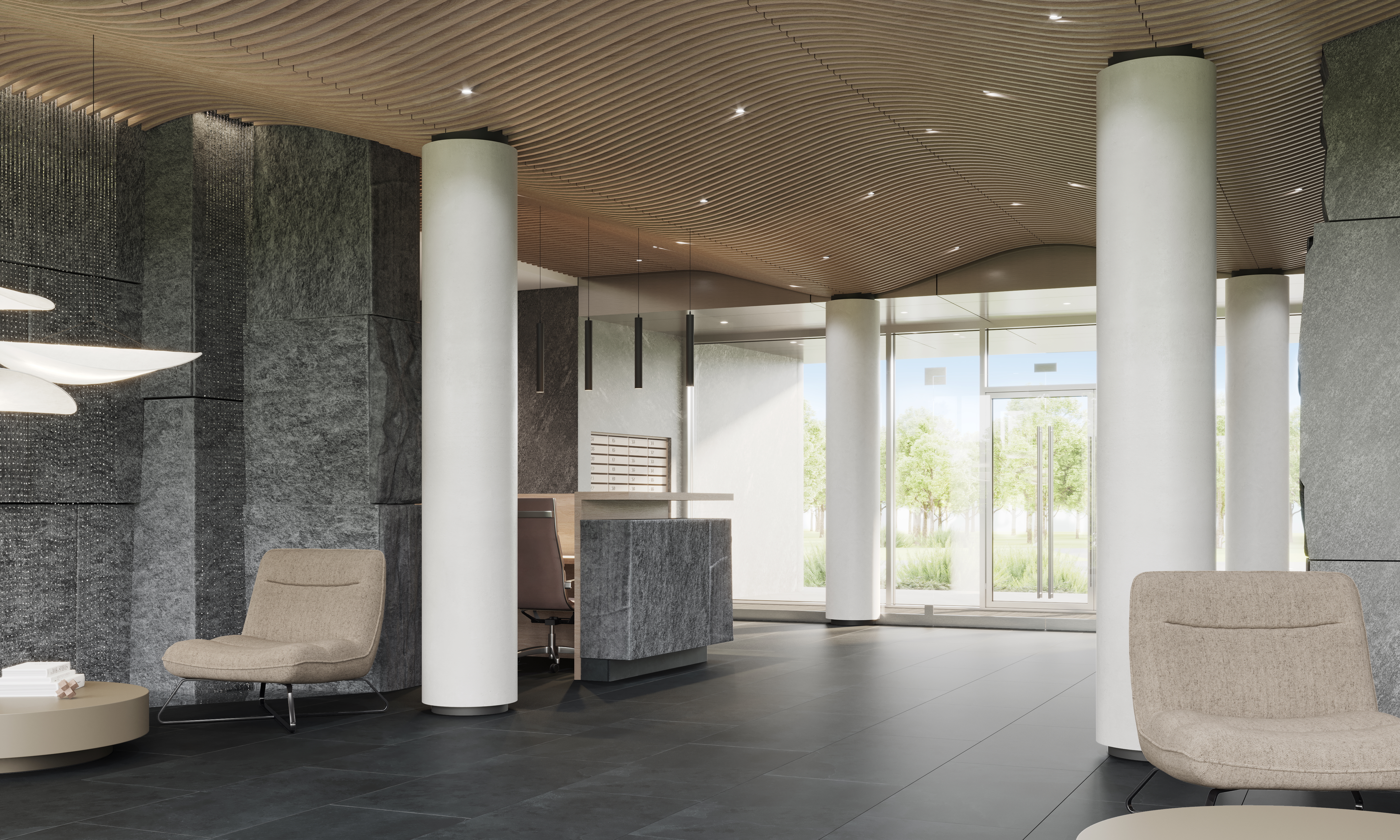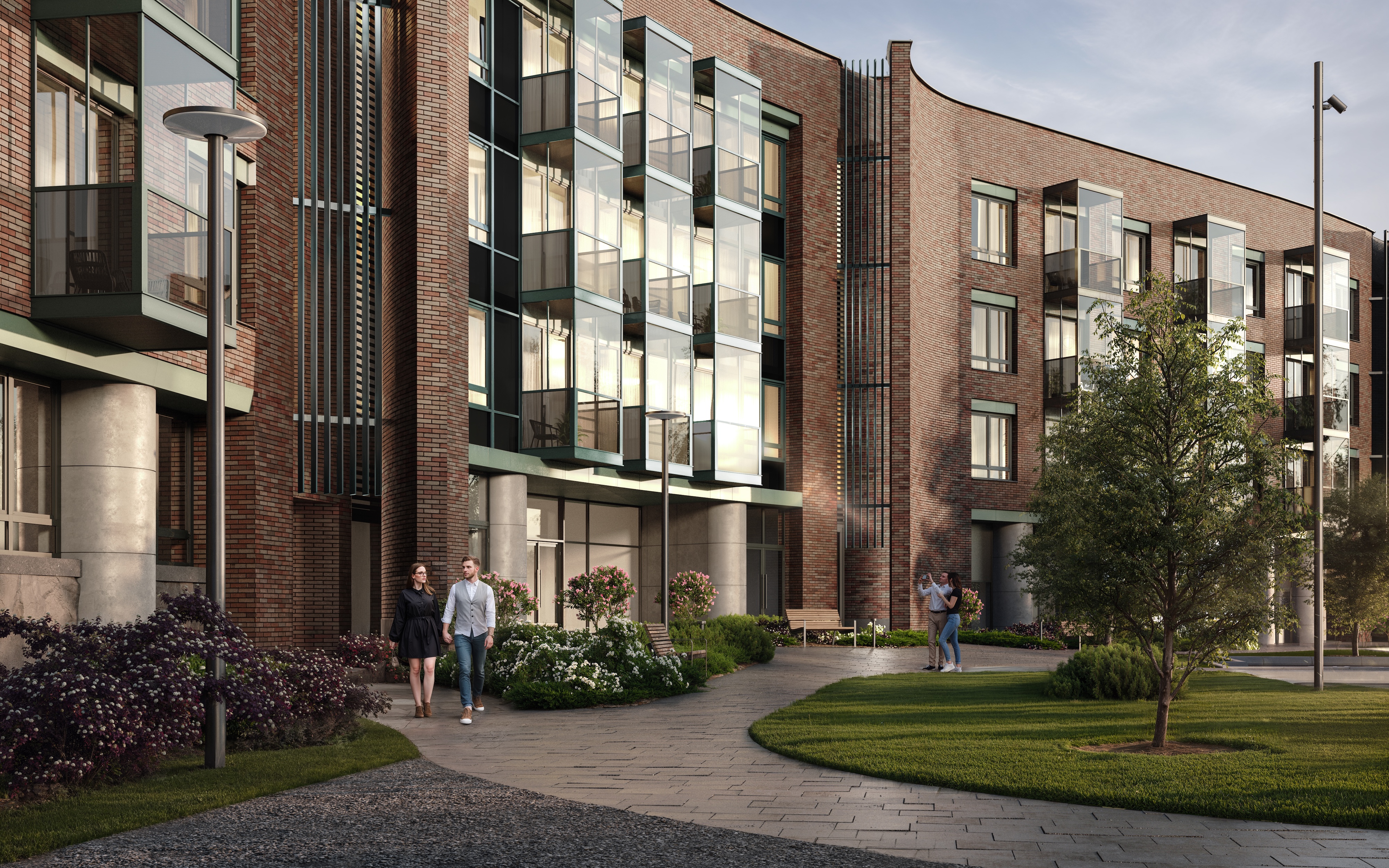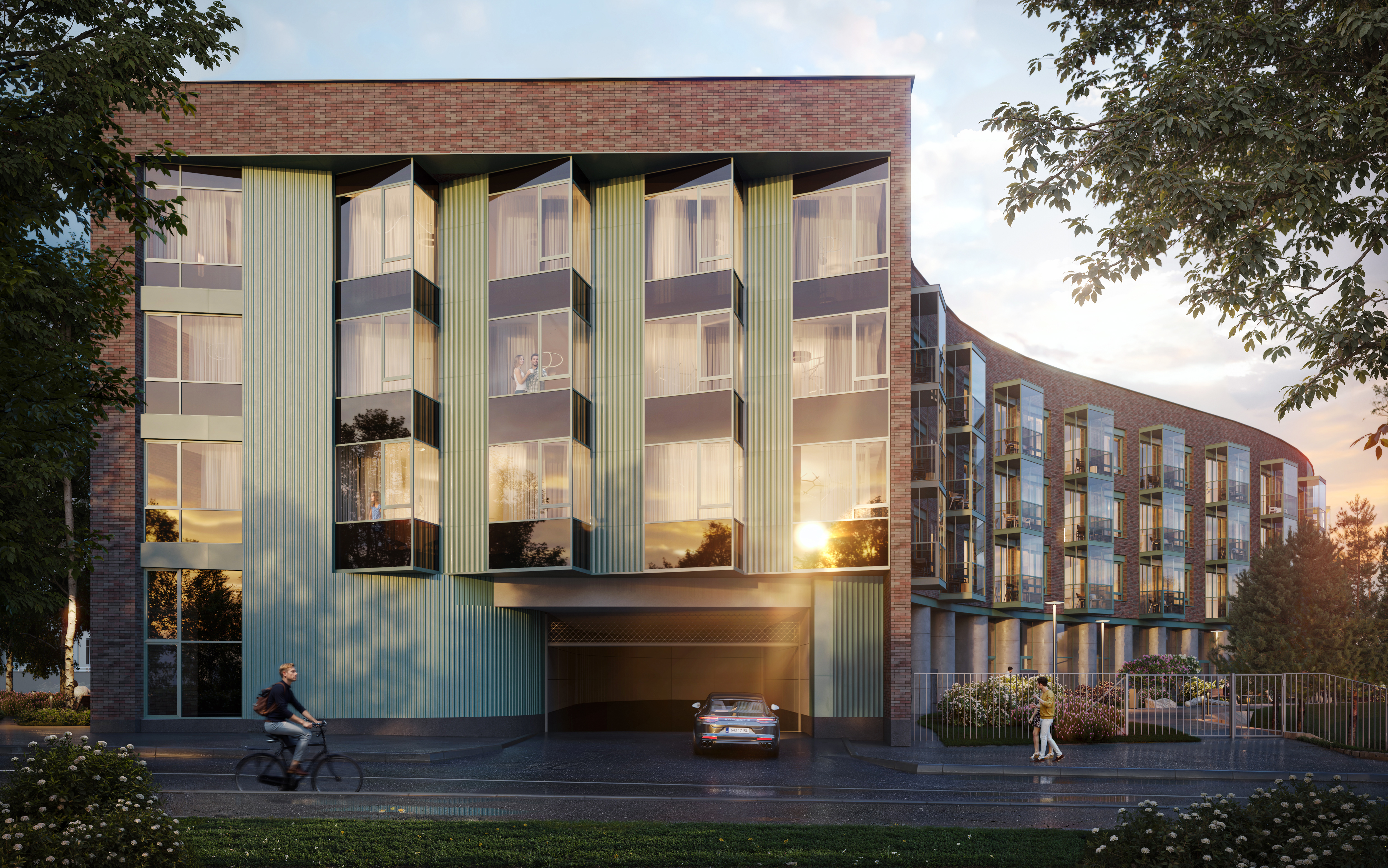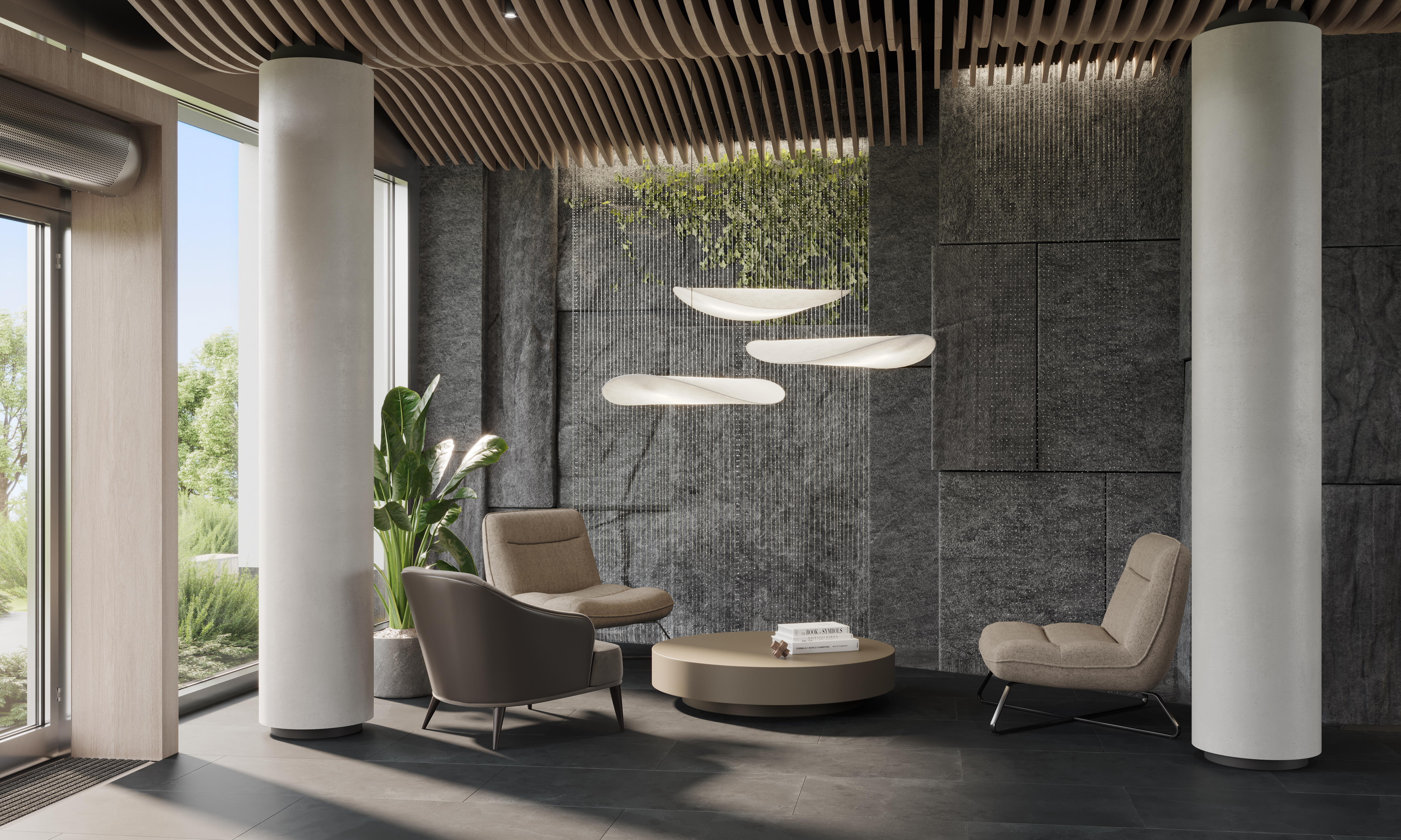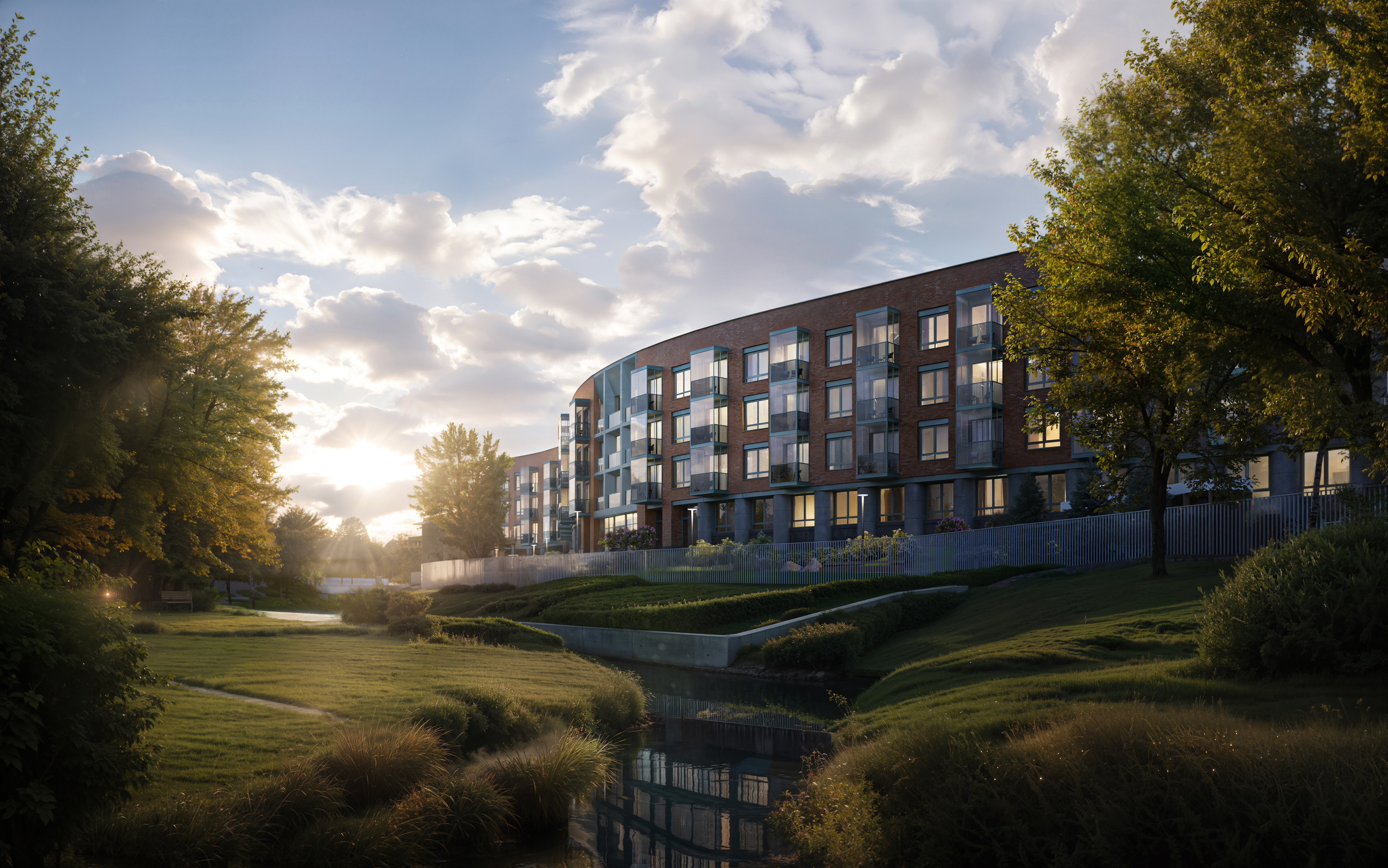 Изящный фасад комплекса визуально созвучен изгибу Жемчужного ручья — течение водоёма у дома продолжается в плавных линиях архитектуры.