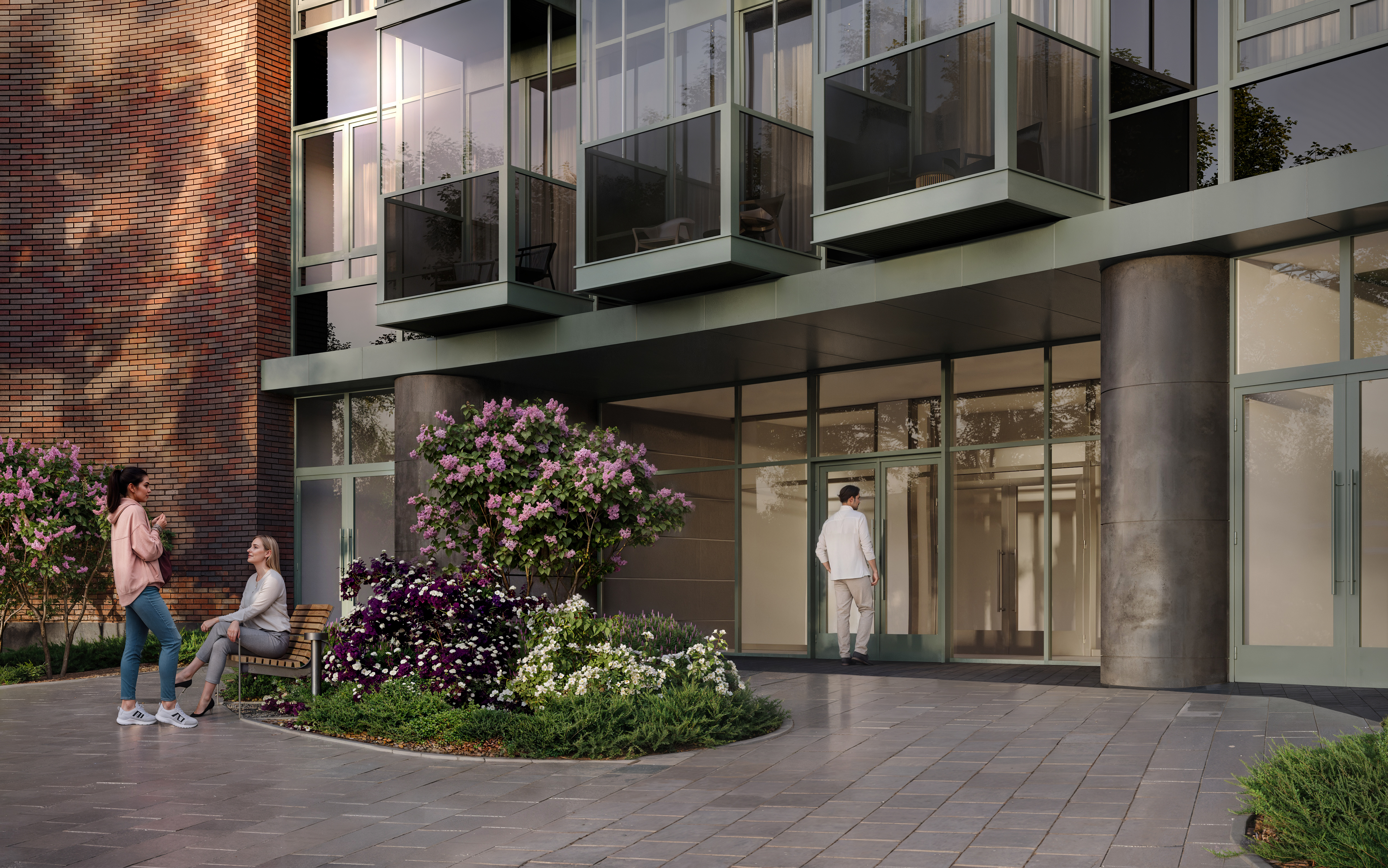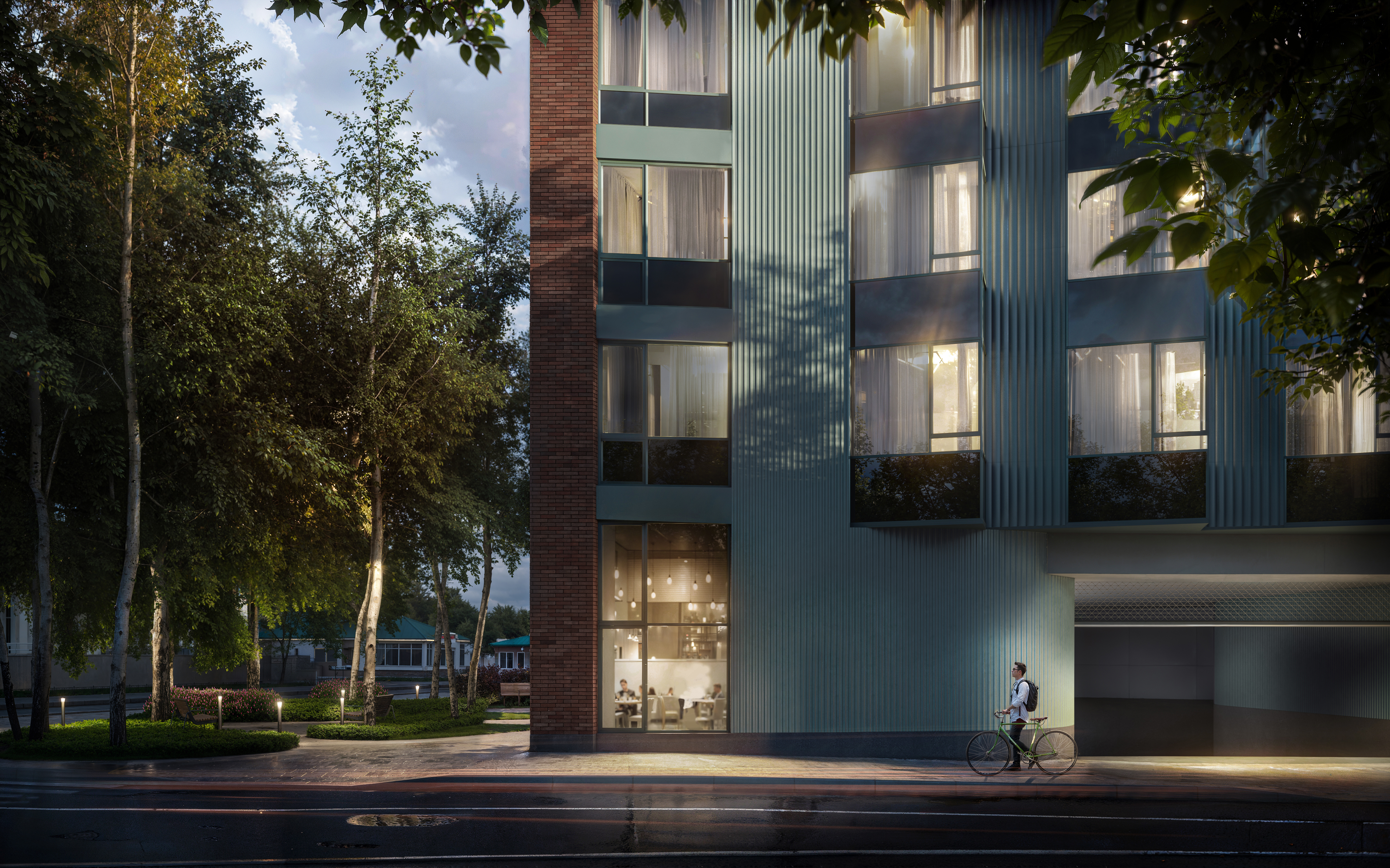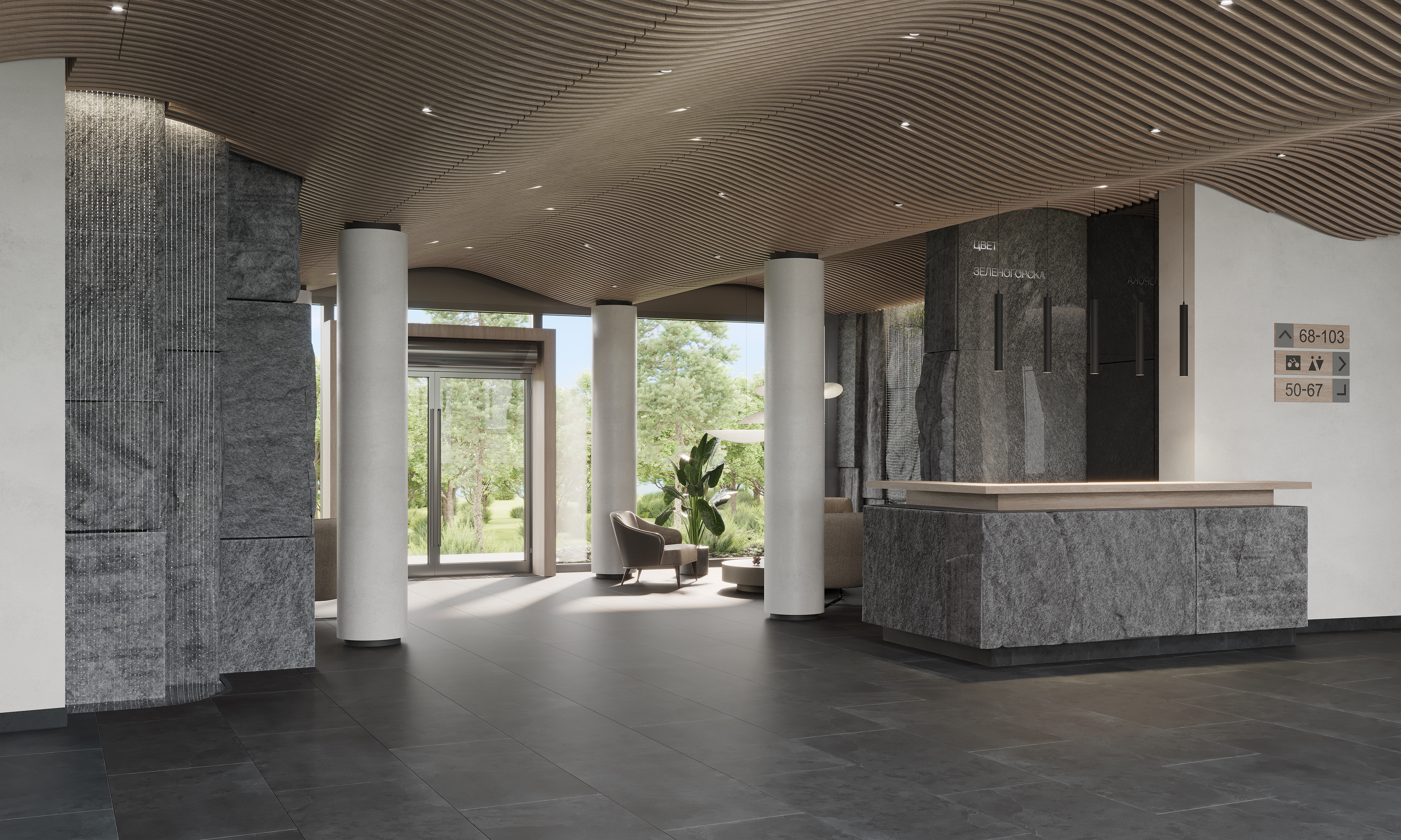 Зелёный двор дома продолжает геопластику, заданную руслом Жемчужного ручья, и ориентирован на умиротворённое созерцание природы.